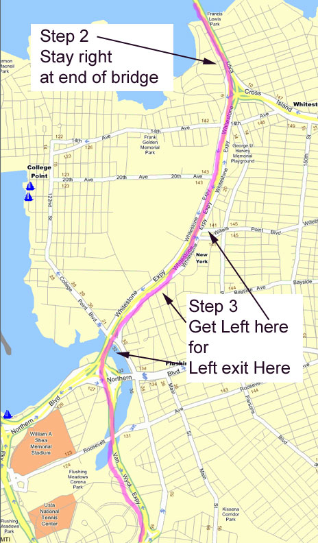 1. Take 95 to Whitestone Bridge Exit 14 off of 95.(Hutchenson Parkway) The bridge toll is $3.50