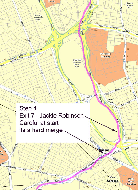 4. Take Exit 7 - The Jackie Robinson parkway (aka Interborough parkway). The Jackie Robinson is VERY Narrow at the start and very turny - be careful.